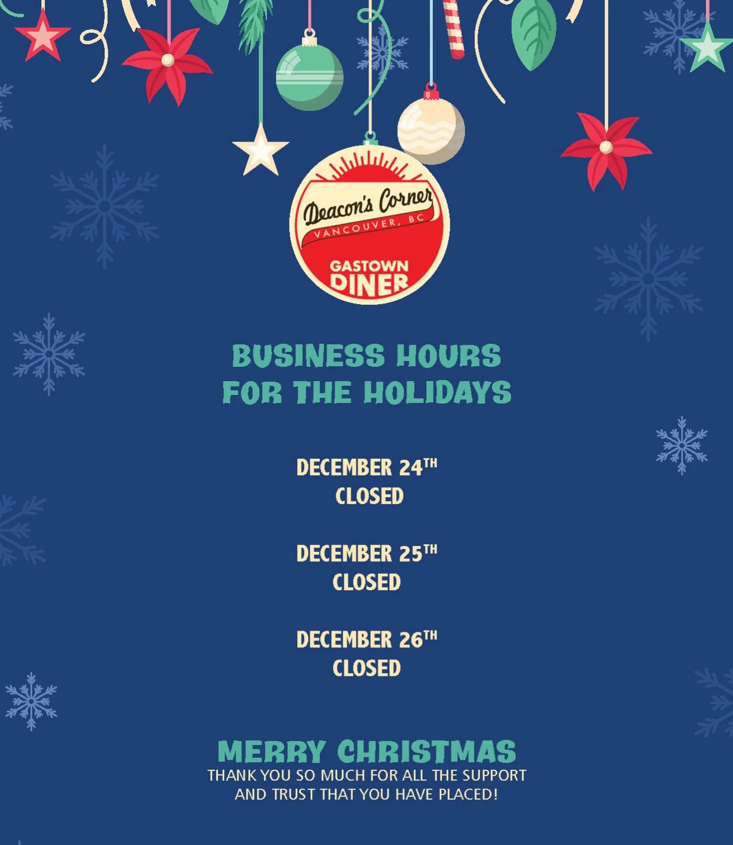 Deacon's Corner was opened in early 2009 inspired by original Deacon's Corner on the Trans Canada Highway outside of Winnipeg. It was a truck stop diner. The concept was keeping the simplicity with house made food and generous portions. Over the past few years, Deacon's corner has evolved with new menus and decor keeping to the original Southern theme.